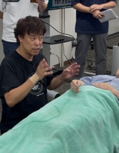 船水先生は日本フェムテックマイスター協会の理事をされていると言うこともあって、今回は特に女性を取り巻く様々な体の不調と鍼灸施術と言う話題を中心にお話をいただきました。例えば月経に伴う諸症状の改善。加齢に伴って骨盤底筋が緩むことによって起こる様々な症状、また女性に限りませんけれども睡眠に関すること、腰痛に関することなどについて解説と、そして後半は実技ということでご講演をいただきました。まず月経に伴う症状の改善に関しては、やはり腹部のツボ「子宮」や「帰来」に鍼をして通電をするといった方法、また三陰交と陰陵泉を結んで通電を行うといった治療法をご紹介いただきました。また実技では、女性のかたに模擬患者になってもらって、下肢や腹部、また頭部への鍼通電療法。また先生の得意とするテイ鍼を用いた施術をご紹介いただきました。何しろ先生はたくさんの芸能人の方に施術したりとか、多くの学会で要職を兼任されていたり、国連を始め世界各国で講演したりといった非常に多岐にわたるご活躍をされているので、そのお話を聞くだけでもこの時間があっという間に過ぎたと言う印象です。今回の学術講演会では「鍼通電療法」がテーマでして、坪井先生も船水先生も鍼通電に関する話題を中心にご講演をいただきました。私も使っておりますけれども、普段は設定を変更するといったことがあまりなく、いわばワンパターンの使い方なんですけども、今回の講演を聞いて私が持っている機械でもまだまだ幅広く応用ができるんだなと言うことを実感して、早速今日からの施術に使っているところでございます。ただ鍼通電療法はあまり東洋医学ではなくて、むしろ西洋医学的です。したがって鍼灸師でなくても、例えばお医者さんも最近は過当競争なので、患者さんの集客にの鍼通電療法に目をつけるところも現れるでしょう。患者さんをベッドに寝かして鍼を刺してしてスイッチを入れるだけだから、それほど先生の手間を取らさないし、効果は抜群で喜ばれるしということで、どんどんとこの分野に参入してくるかもしれません。すると我々鍼灸師の住む森が壊されてゆくわけです。そこで我々鍼灸師としては、ただ筋肉の硬いところとか痛いところに鍼を刺して電気を流すんだといったことではなくて、あくまでも経絡経穴を考えた施術をする。その基本的な部分を譲らなければですね、鍼通電療法も鍼灸師の森として残していけるんじゃないかと思いました。