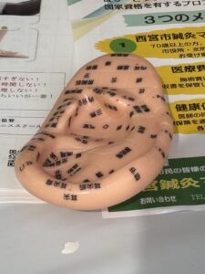 この催しに合わせて(株)セイリン様より「こりスポッと」のサンプルを200個提供いただきました。こりスポッとは鍼ではないので今回のようなイベントでも安心して使えますし、直径が9ミリと小さいので耳ツボに貼るには適しています。スタッフには普段耳鍼を活用している人、していない人がありましたが、祭りの開始前にお互いで練習したりしてみんなうまく貼れるようになりました。こりスポッとを左右の耳の「神門」に貼って、全身のバランスを整えますと説明を加えました。