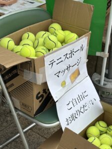 またそれに加えて毎年恒例の「テニスボールマッサージ」の体験として、テニスボールを配りながらボールを使ったマッサージの説明書を配布いたしました。
